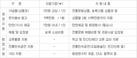 또한, 지원종류와 기준은 1회당 모객인원에 따라 기념품 및 홍보·광고지원, 만찬(식사)제공, 전통문화 체험 및 관광시설 입장료 중에서 2개 항목까지 지원받게 되며, 그밖에 학생 및 단체교류 섭외, 전통민속공연 지원, 환영현수막 게첨 등을 지원받을 수 있다.