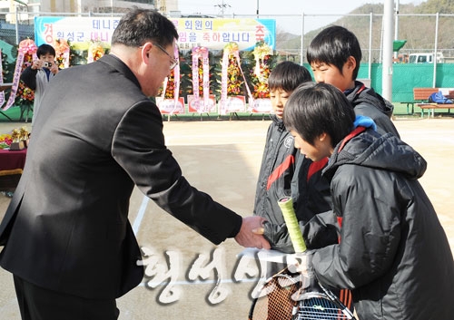 |  | | | ↑↑ 횡성군테니스연합회 김재문 취임회장이 우천초등학교 테니스 선수들에게 훈련비를 전달하고 있다. | | ⓒ 횡성신문 | | 한편, 이날 횡성군테니스연합회는 우수 선수 육성을 위해 우천초교와 우천중 테니스 선수들에게 훈련비를 전달했다.