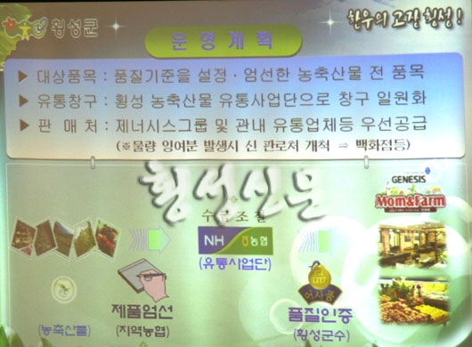 횡성군은 지난 3월 4일 국내 최대 유통회사인 제네시스그룹과 유통 협약식을 체결, 횡성군에서 생산되는 농축산물의 안정적 유통망 확충 및 유통체계 구축은 물론, 제너시스 그룹의 세계적인 체인망을 활용한 해외시장 진출 방안을 모색해 나가고 있다.