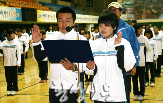 |  | | | ↑↑ 횡성중학교 정윤상(역도) 선수와 대동여중 이아영(배드민턴) 선수가 필승을 다짐하며 선서를 하고 있다. | | ⓒ 횡성신문 | | 한편, 이날 역도 종목에 출전하는 횡성중학교 정윤상 선수와 배드민턴 종목에 출전하는 대동여중 이아영 선수는, 선서를 통해 스포츠 정신에 입각해 정정당당히 그동안 배우고 익힌 기량을 마음껏 발휘하여 반드시 종합우승을 하겠다는 각오를 밝혔다. |