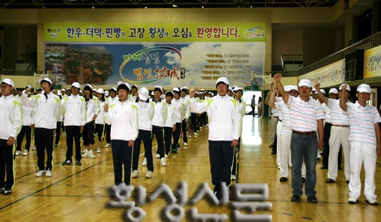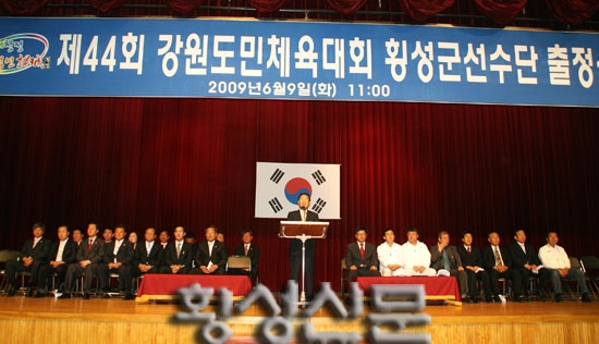 |  | | | ⓒ 횡성신문 | | 이날 한규호 횡성군수는 출정사에서 “그동안 도민체전 출전을 위해 맹연습 하느라 땀방울을 흘리고, 수고를 아끼지 않은 임원 및 코치 여러분의 노고에 감사한다”며 “지난해에는 우리군이 아깝게 준우승에 그쳤지만, 올해는 그동안 선수들이 흘린 땀방울이 횡성군민의 열렬한 응원과 성원속에 종합우승이라는 영광으로 돌아와, 군민들에게 희망을 안겨 주었으면 한다”고 당부했다.