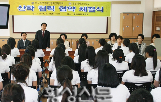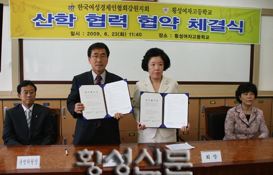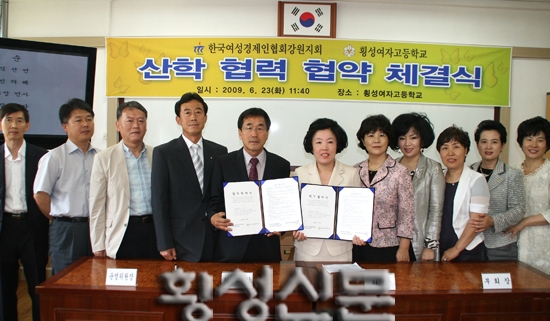 |  | | | ⓒ 횡성신문 | | 여성들의 사회 참여 및 지위가 향상되고 있는 가운데 횡성여자고등학교(교장 우광수)가 지난 23일, 참신한 여성CEO 양성을 위해 한국여성경제인협회 강원지부(회장 이금선)와 동반자적 관계를 형성해 나가기 위해 산학협력협약 체결식을 가졌다.