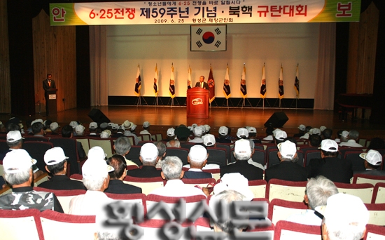 |  | | | ⓒ 횡성신문 | | 잊지도 못하고 잊을 수도 없는 그 날, 6‧25가 발발한 지 올해로 59주년을 맞아, 지난 25일 횡성문화관에서는 횡성군재향군인회(회장 전상규) 주관으로, 북핵 규탄을 위한 기념식이 거행됐다.