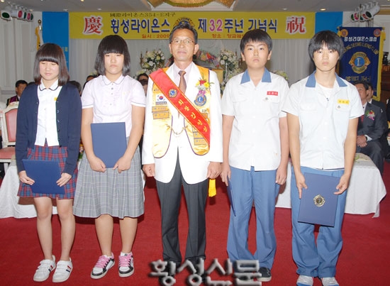 |  | | | ⓒ 횡성신문 | | 이와함께 횡성라이온스클럽은 이날 대동여중 김민지(3학년), 정은영(1학년) 학생과 횡성중 곽희송(2학년), 김흥수(1학년) 학생 등 관내 모범학생 4명에게 장학금을 각각 전달했다.