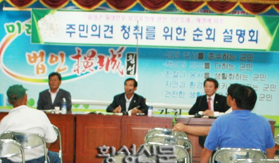 지난 1일 횡성읍과 둔내면을 시작으로 주민의견 청취에 나선 설명회장에는 축산농가와 횡성축협 직원, 각 마을이장, 지역주민 등이 참석한 가운데 저녁 8시부터 장장 2시간 30분 가량 시종일관 진지하게 진행됐다.