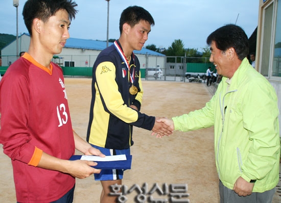 |  | | | ↑↑ 횡성군족구연합회 김은영 회장이 일반부 우승을 차지한 솔개족구단 대표에게 우승 상장과 메달을 전달하고 있다. | | ⓒ 횡성신문 | | |