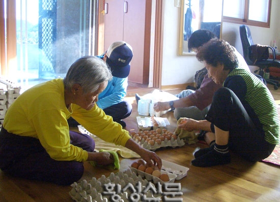 몇몇의 마을주민들이 양계장에서 방금 나은 유정란을 수거하느라 분주하고, 2군데 나누어져 있는 양계장에서 모은 유정란을 한알 한알 정성스레 닦는 모습이 정겹다.