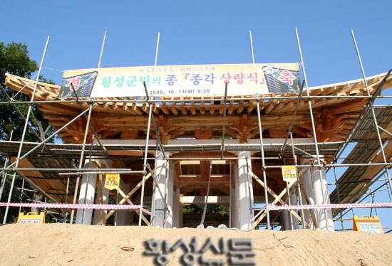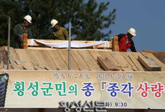 |  | | | ⓒ 횡성신문 | | 횡성군민의 종이 상량식을 갖고, 종각 건립에 본격 돌입했다.횡성읍 읍하리 40번지 횡성군청 뒷편 3·1공원내에 건립될 군민의 종 종각은 45㎡ 규모로 5억1240여만원이 투자되어 팔각지붕, 이익공 구조로 설계되어 지난 3월 19일 착공, 오는 12월 준공될 예정이다.