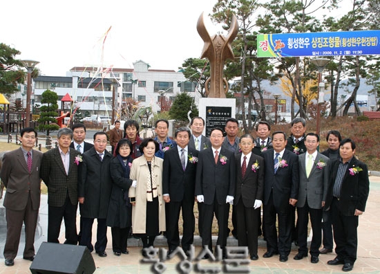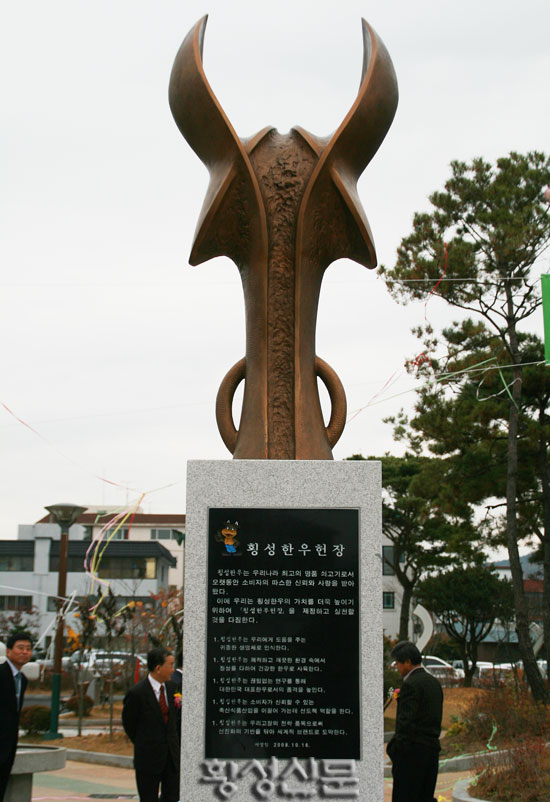 |  | | | ⓒ 횡성신문 | | 이날 제막식에서 횡성군 장신상 축산과장은 경과보고를 통해 “횡성한우 고유의 가치를 예술적으로 승화하고, 횡성한우의 이미지를 극대화 하기 위해 횡성한우 상징 헌장탑을 건립하게 되었다”며 “2009년 2월 12일부터 3월 11일까지 연구용역을 시작으로, 4월 13일 설치계획을 수립한 후 작품공모 작업을 거쳐 8월 10일 제작 업체를 선정하여 제작하게 되었으며, 군내에서는 6번째의 한우 상징물이 되었다”고 밝혔다.