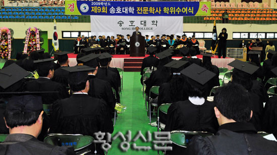 송호대학(총장 장기옥) 2009학년도 제9회 전문학사 학위수여식이 18일 월계관에서 열렸다.