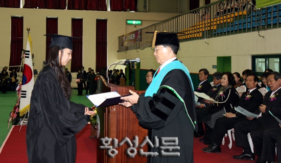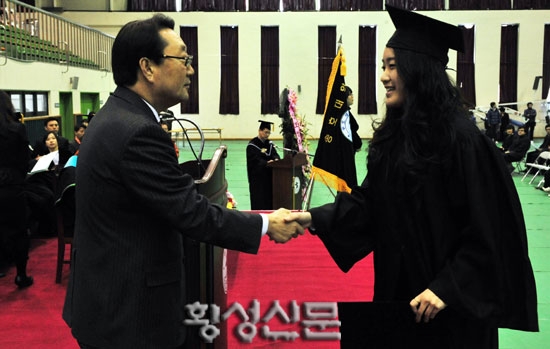 |  | | | ⓒ 횡성신문 | | 이날 김현민(스키스노보드과)학생이 전체수석을 차지했으며, 안희영(유아교육과)학생이 졸업생 377명을 대표해 영광의 학위증서를 수여받았다.