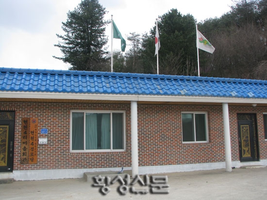 황재를 넘어서자 도로 왼편으로 파란색 기와를 얹고 단정히 자리 잡은 건물이 보인다. 바람따라 펄럭이는 깃발이 현천4리 마을회관과 경로당임을 알려 준다.