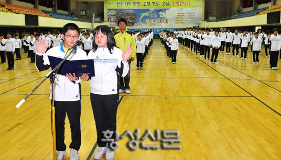 |  | | | ⓒ 횡성신문 | | 자라는 소년, 소녀에게 스포츠를 접할 수 있는 기회를 주어, 스포츠 정신을 고취하고 균형 있는 신체의 발달과 기초체력을 배양하여 평생체육의 기틀을 마련하며, 장래 국가를 대표할 수 있는 우수선수 발굴에 목적을 두고 지난 12일부터 15일까지 태백시에서 개최된 2010 강원도소년체전 횡성선수단 결단식이 지난 10일 횡성실내체육관에서 개최되었다.