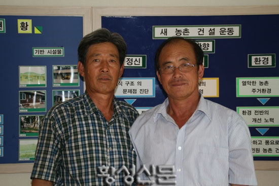 |  | | | ↑↑ 주운석 이장(좌), 정석교 마을복지지도자(우) | | ⓒ 횡성신문 | | 새말 lC에서 나온 뒤 42번 국도로 가다보면 안흥면 소재지가 나온다. 여기서 지방도 411호선을 따라 10여분 달리다 보면 전형적인 농촌의 아름다움이 보이는 성산리(이장 주운석)가 나온다.