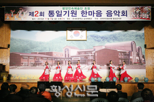 |  | | | ⓒ 횡성신문 | | 한편, 남원봉 한국자유총연맹 횡성군지부 사무국장은 “이번 탈북 예술단의 초청공연이 주민들에게 북한문화를 접할 수 있는 기회를 제공하고, 나아가 평화통일의 의미를 되새기는 소중한 자리가 되었다”고 말했다. |