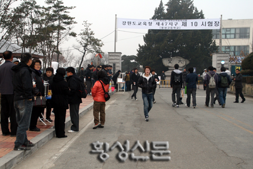 |  | | | ⓒ 횡성신문 | | 지난해에 이어 두 번째로 횡성지역에서 치러진 2011학년도 대학입학 수능시험이 지난 18일 횡성고등학교와 횡성여고 등 2곳에서 치러지면서, 횡성고등학교와 횡성여고 고사장의 분위기는 수험생을 격려하기 위한 재학생 및 동문, 그리고 학교 어머니회 수험생 가족들이 이른 아침부터 장사진을 이루었다