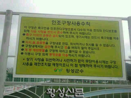 인조잔디구장에 설치된 인조구장 사용수칙을 보면 축구이외의 운동은 금지되어 있으며, 경기 시에는 반드시 축구화를 착용토록 표기되어 있으며 이를 포함한 5가지의 수칙을 안내하며, 이를 위반하거나 사전 허가없이 무단 이용시에는 구장사용을 제한 조치한다고 되어있다.