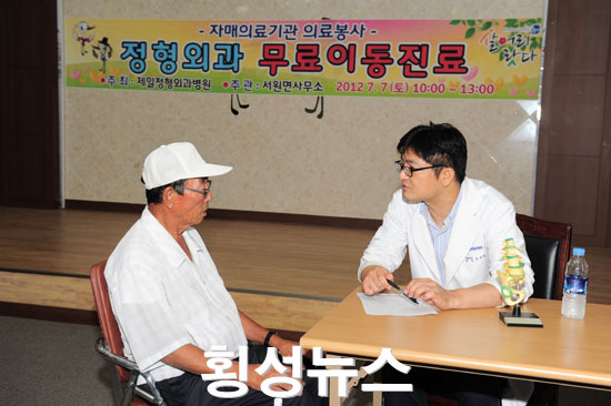 |  | | | ⓒ 횡성뉴스 | | 서원면 자매결연병원인 서울 역삼동 제일정형외과병원(원장 신규철)은 지난 7일 오전 10시부터 오후 1시까지 서원면사무소 2층 복지회관에서 지역주민을 대상으로 무료이동진료를 실시하였다.