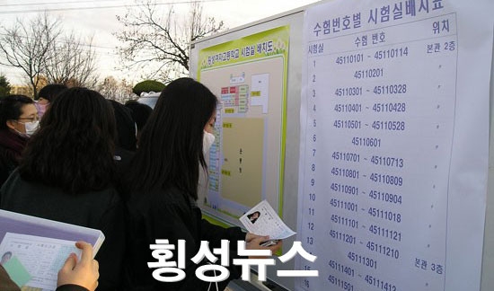한편 지난해 횡성군의 2013학년도 수능시험 총 지원자는 411명(남 248명, 163명)이었고 2014학년도 수능시험은 11월 7일 실시된다.