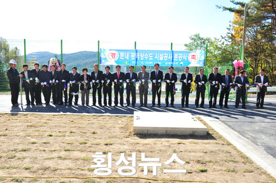 |  | | | ↑↑ 지난 22일 둔내배수지에서 고석용 군수, 이대균 의장, 군의원, 주민 등이 참석한 가운데 둔내 광역상수도 시설 준공식이 열렸다. | | ⓒ 횡성뉴스 | | 둔내지역 주민들에게 깨끗하고 안정적인 양질의 생활용수를 공급하고 산업단지, 레저산업 유치 등을 위해 둔내 광역상수도 시설공사 사업을 추진한다.