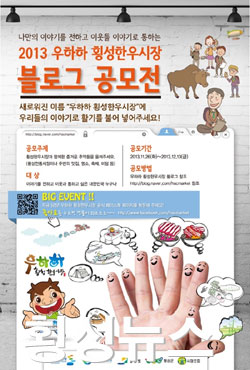 |  | | | ⓒ 횡성뉴스 | 횡성문화관광형시장육성사업단에서는 횡성전통시장의 새로운 이름을 널리 알리고 국민의 관심 및 다양한 콘텐츠를 활성화 시키고자 오는 12월 13일까지 횡성한우시장과 함께한 즐거운 추억들을 공유를 주제로 ‘2013 우하하 횡성한우시장 공모전’을 진행한다.