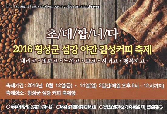제1회 횡성군 섬강 야간 감성커피축제(축제공동위원장 최경화, 이덕원)가 오는 12일부터 14일까지 섬강(감성마을) 일원에서 ‘농경생활문화+감성커피문화의 만남, 한여름 밤 커피 그리고 막걸리와 함께 추억을’ 이라는 주제로 열린다.