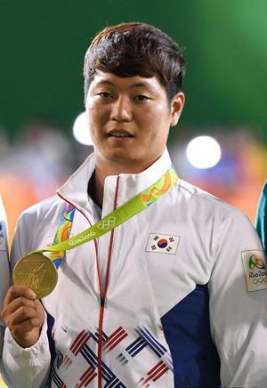 | ↑↑ 리우올림픽 양궁 남자대표팀 시상식에서 이승윤 선수가 금메달을 보이며 포즈를 취하고 있다. |