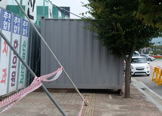 특히, 공사장주변 인도는 지난 6일 학생들의 통행이 빈번한데 아무런 안내표지도 없고, 인도에 컨테이너를 놓아 보행자들이 차도로 다니고 있는 실정으로 문제가 심각하다.