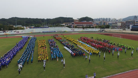 | ↑↑ 종합운동장에서 열린 군민체육대회에서 각 읍·면 선수단의 개성 넘치는 입장식 모습을 하늘에서 드론으로 촬영. |