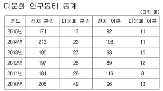 반면 다문화 이혼건수는 2012년부터 혼인건수의 절반 정도가 이혼하고 있다. 다문화 이혼건수는 2010년 13건, 2011년 8건, 2012년 12건, 2013년 15건, 2014년 11건, 2015년 11건의 수치를 기록했다.