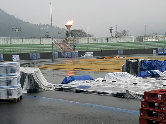 | ↑↑ 제52회 강원도민체육대회 개회식이 열리는 종합운동장 개·보수 작업이 마무리 단계에 한창이다. |