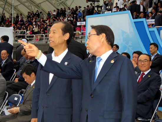 | ↑↑ 설명하는 한 군수 = 한규호 군수가 손으로 무언가를 가리키며 최문순 강원도지사에게 행사에 대해 설명하고 있다. |
