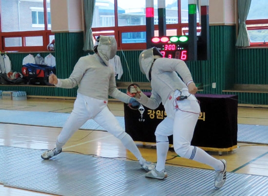 | ↑↑ “포인트 추가요~”= 대동여중 펜싱경기장에서 열린 남자 에페 경기에 출전한 두 선수가 점수를 얻기 위해 공격을 하고 있다. |