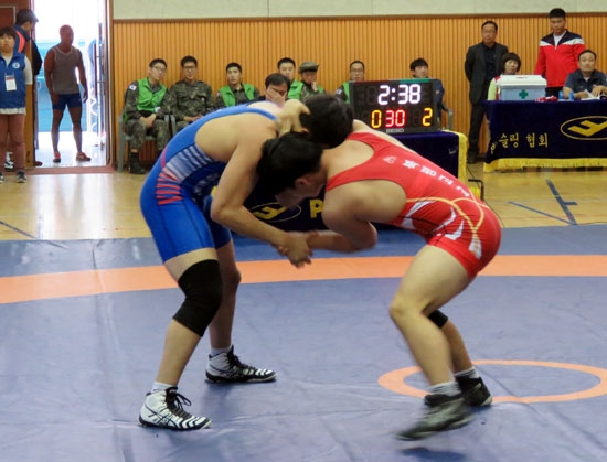| ↑↑ 으랏차, 젖먹던 힘까지!= 성북초교 체육관에서 열린 레슬링 종목에서 출전 선수들이 열띤 경기를 펼치고 있다. |