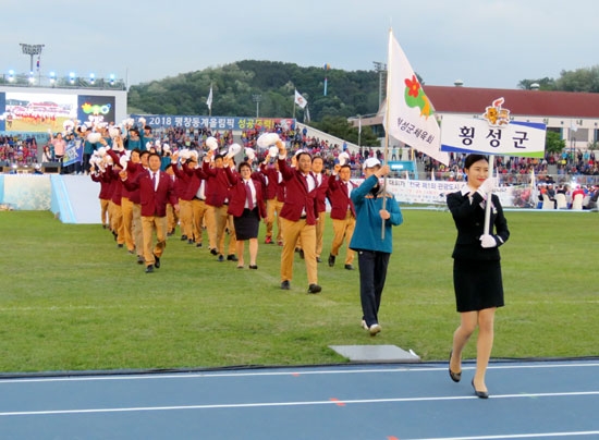 | ↑↑ 횡성선수단 입장= 도민체전 개막식에서 횡성군 임원 및 선수단 807명이 관중들의 환호를 받으며 입장하고 있다. |