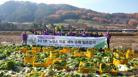 이에 올해도 어김없이 1사1촌 자매결연 마을인 강림면 강림2리 노구소 마을에서, 주민들과 함께 김장배추 수확 일손돕기 행사에 참여하였다.