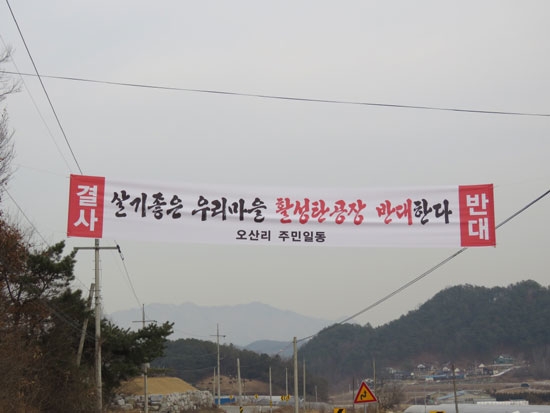 | 공근면 오산리 주민들이 마을 입구에 ‘살기좋은 우리마을 활성탄공장 반대한다’라는 문구가 적힌 현수막까지 게첨하면서, 마을 주거환경 훼손이 우려된다며 집단 반발하고 있다.