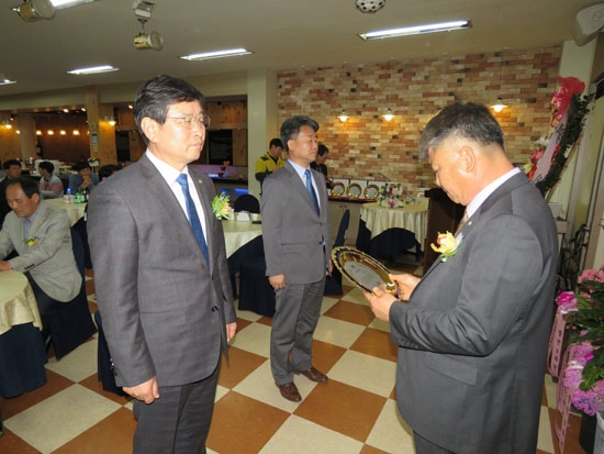 | ↑↑ 지난 2일 향교웨딩홀에서 열린 기념식에서 본사 안재관 대표이사가 상패를 수여하고 있다. |
