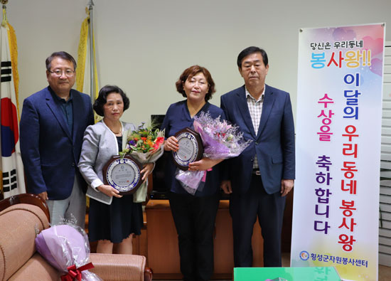 | 횡성군자원봉사센터는 5월 우리동네 봉사왕에 개인으로 조추자(둔내면, 65세)씨, 단체로 포순이봉사단 둔내여성회(회장 최순이)를 선정하고, 5월 29일 둔내면행정복지센터에서 표창패 수여식을 가졌다.