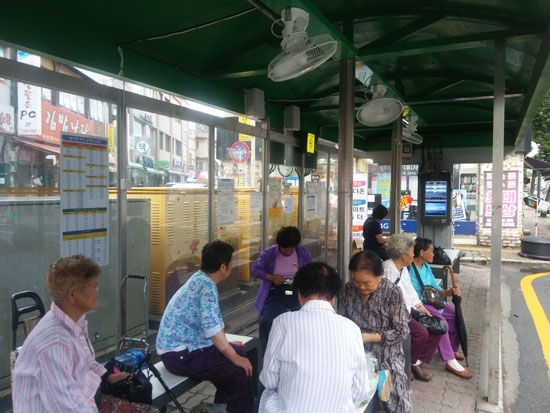| ↑↑ 시원한 환경에서 농어촌버스를 이용할 수 있도록 선풍기가 설치된 삼일광장 버스승강장. |