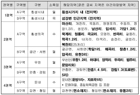 이를 위해 횡성 관내 4개 방역업체에 차량방역을 위탁해 실시해오고 있으나 읍·면소재지나 주택 밀집 지역에서는 방역의 혜택을 누리고 있지만 읍·면에서 멀리 떨어진 마을은 1년 내내 방역의 혜택을 누리지 못해 형평에 어긋난 방역 행정이라고 불만이 높다.