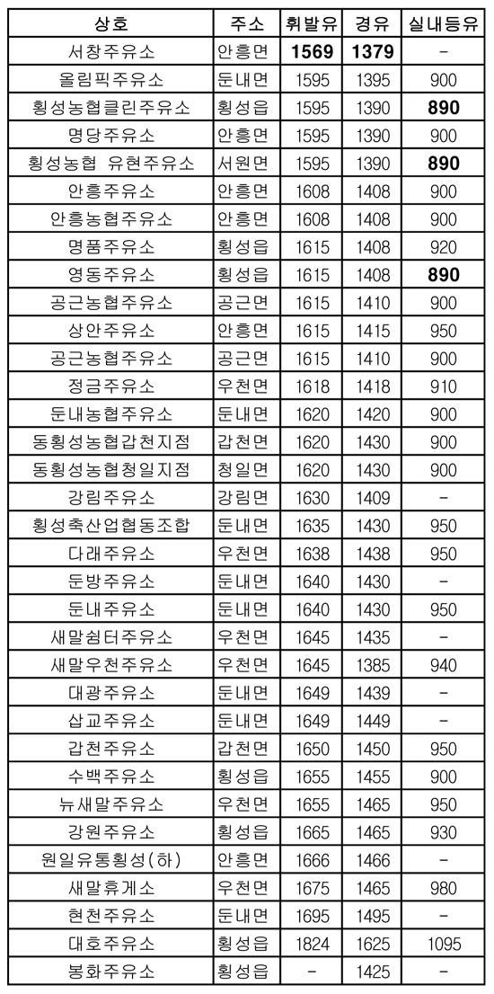 한국석유공사 유가정보 서비스 오피넷이 지난 28일 발표한 유가정보에 따르면 휘발유의 경우 대호주유소(횡성읍)가 1,824원으로 가장 비싸고, 저렴한 곳은 서창주유소(안흥면)가 리터당 1,569원으로 리터당 평균가격 1,635원에 비해 66원정도 저렴했으며, 가장 저렴한 곳과 비싼 곳을 비교하면 리터당 255원의 가격 차이가 벌어지고 있는 것으로 나타났다.