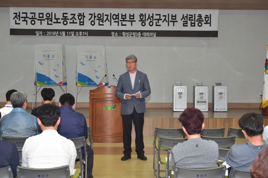 | ⓒ 횡성뉴스 | 그 동안 노조가 없던 횡성군청 소속 공무원들이 올해 4월 21일 횡성군 공무원노동조합 준비위원회를 출범하고, 5월 11일 창립총회를 거쳐 성기영 노조위원장을 비롯한 임원을 선출함과 동시에 공무원의 기본인권 및 권익신장을 위해 공식적인 노조 활동에 나서고 있다.