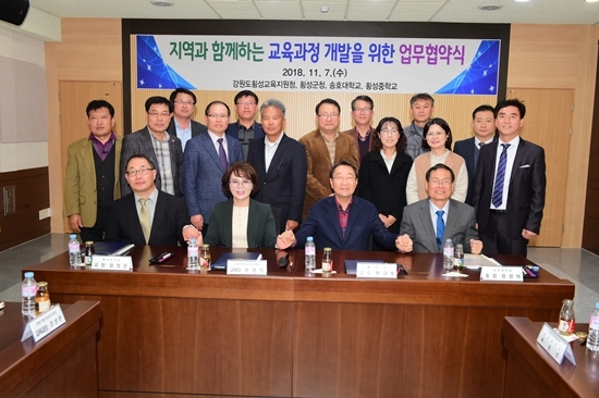 | 횡성교육지원청(교육장 양경희)은 지난 7일 횡성교육지원청 회의실에서 한규호 군수, 정창덕 송호대학교 총장, 장의진 횡성중학교 교장 등이 참석한 가운데 지역 향토산업 연계 지역교육과정 개발·운영을 위한 업무협약을 체결했다.