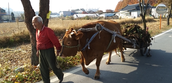 한적한 시골길을 정겹게 거니는 할아버지와 소달구지가 깊어가는 가을에 옛 향수를 떠오르게 하고 있다.