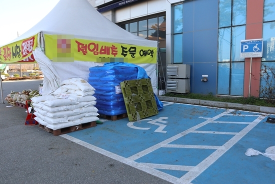 | ↑↑ ▲지난 12일 한 매장 앞 장애인 주차구역. 장애인전용주차구역에 물건을 쌓거나 그 통행로를 가로막는 등 주차를 방해하는 행위는 과태료 50만 원 부과 대상이다. |