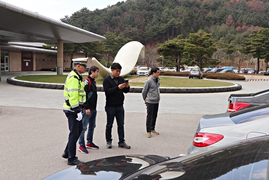 파란색으로 표시된 장애인주차구역에 ‘보호자 운전용’ 표지를 부착하고 주차된 SUV차량으로 남학봉 주무관이 다가갔다. 해당 표지를 유심히 살핀 남학봉 주무관은 횡성군청으로 부정 사용 조회를 요청했다.
