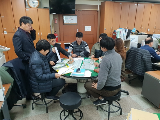 | ↑↑ ▲지난 4일 김종선 과장, 김상곤 도청 관계자, 산림과 직원, 측량업체 대표가 한자리에 모여 산지관리법상의 규제완화간담회 자리를 가졌다. |