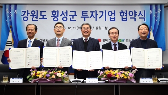 강원도(최문순 도지사)와 횡성군(한규호 군수)은 지난 11일 오후 2시 강원도청에서 유성씨앤에프(주)(대표: 황호진), (주)디피코(대표: 송신근), 웰텍(주)(대표: 이성식) 3개 기업과 투자협약을 체결했다.