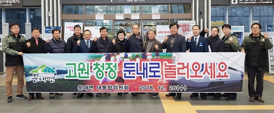 둔내면 대통합위원회(위원장 전성택)는 구랍 26일 오전 11시 KTX 강릉선 둔내역에서 둔내 홍보 캠페인 행사를 진행했다.